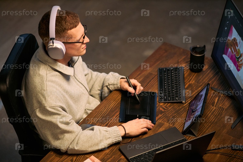 Молодой белый мужчина использует цифровые планшеты для работы с графическим дизайном