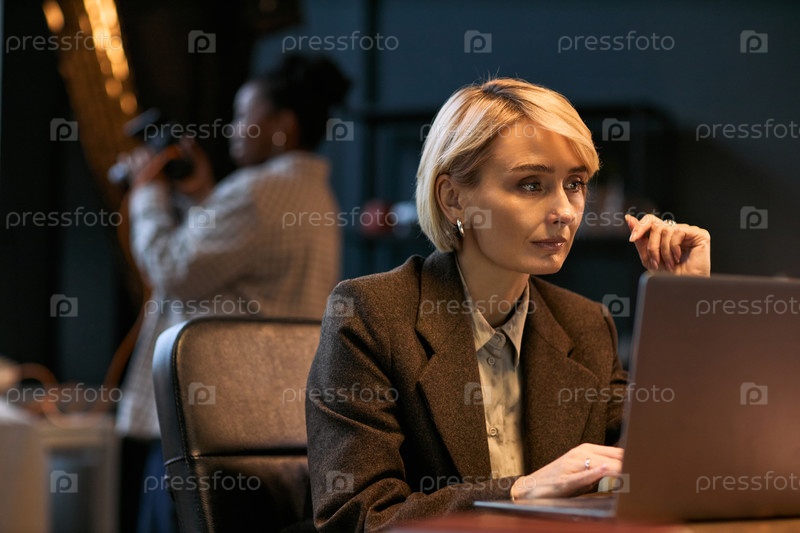 Белокожая зрелая женщина работает на ноутбуке с черной женщиной в фоне
