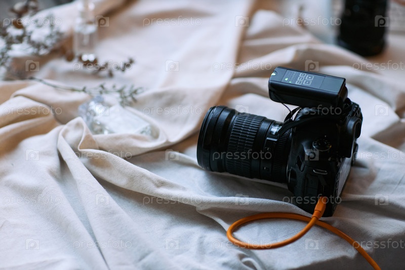 Профессиональная цифровая камера с флэш-трейгером, отдыхающая на тканевой поверхности