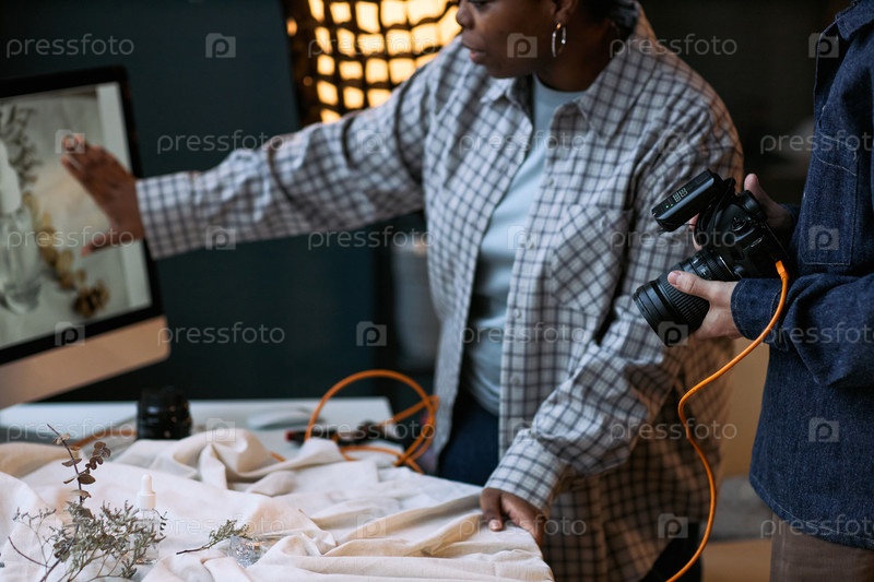 Молодая взрослая чернокожая женщина сотрудничает с мужчиной в проекте по фотографии