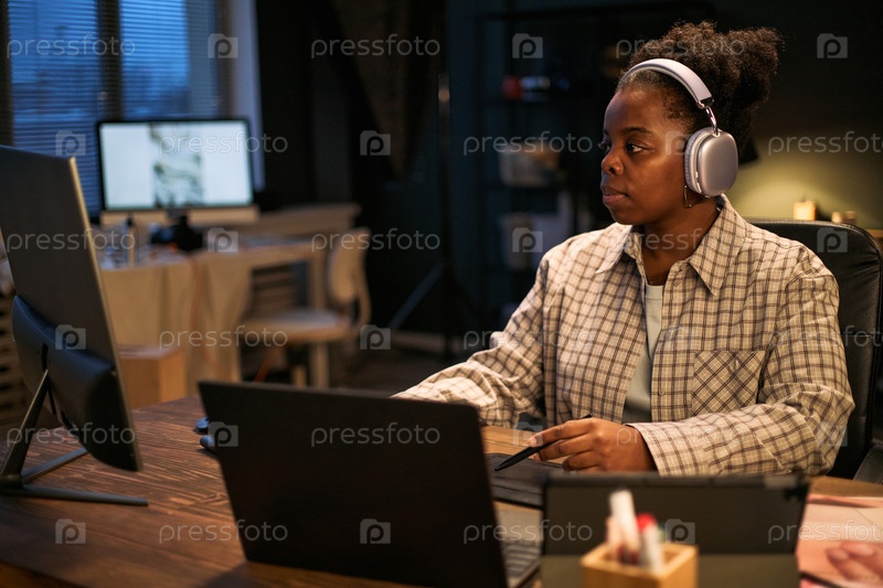 Молодая взрослая чернокожая женщина работает за рабочим столом, используя компьютер и наушники