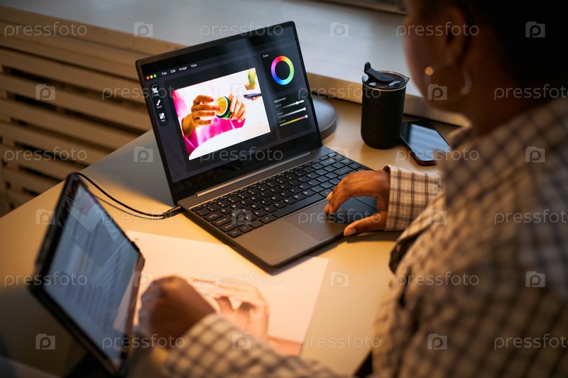 Молодая взрослая чернокожая женщина использует ноутбук и планшет для создания цифрового искусства