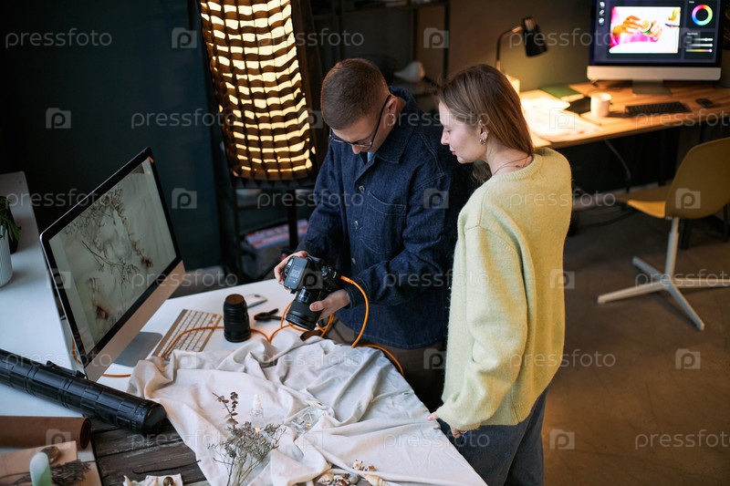 Молодой белый мужчина и женщина просматривают фотографии на цифровой камере в студии