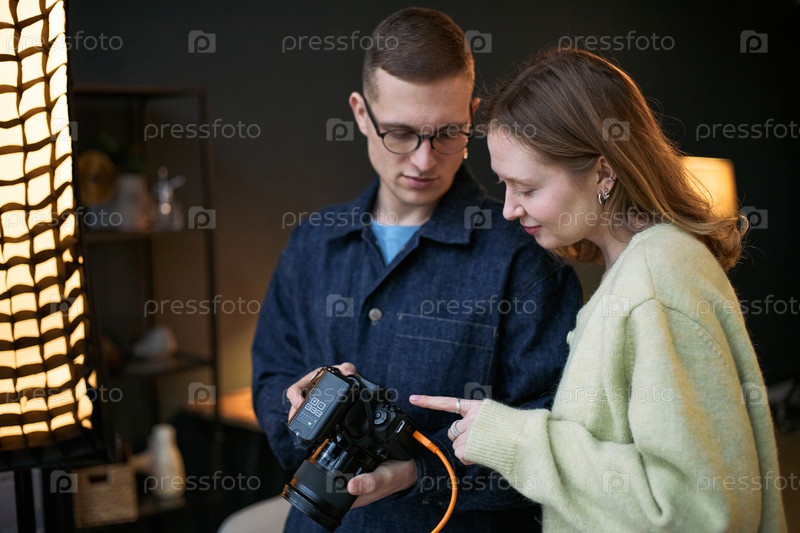 Молодой белый мужчина и женщина просматривают фотографии на профессиональной камере вместе