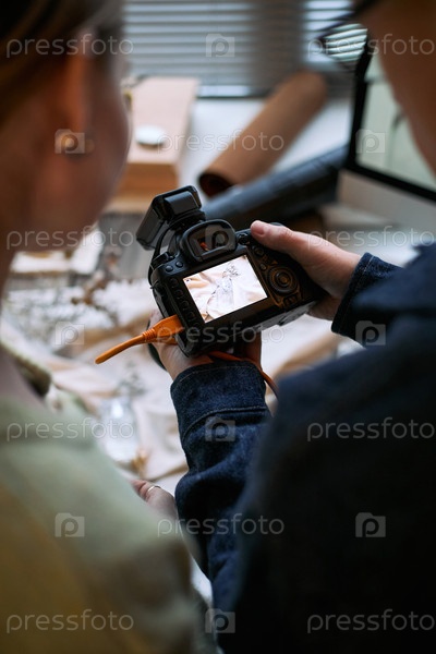 Молодая белая женщина и молодой мужчина просматривают фотографии на цифровой камере вместе