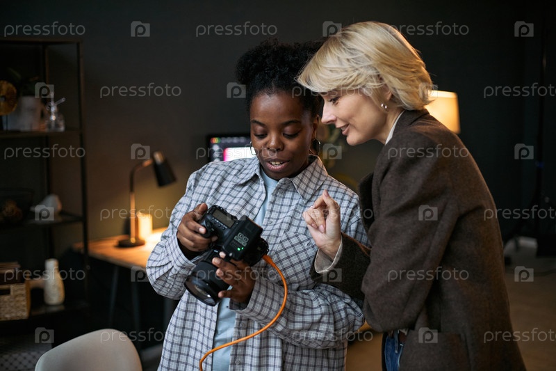 Молодая взрослая черная женщина показывает экран камеры зрелой белокожей женщине