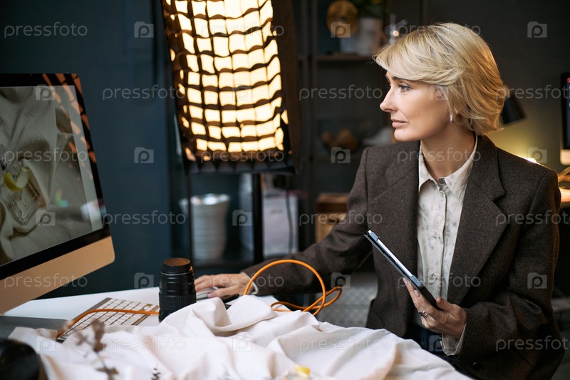 Кавказская женщина средних лет, работающая с цифровым планшетом в креативной студии