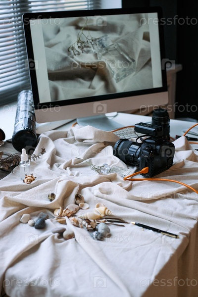 Профессиональный цифровой фотоаппарат фотографирует композицию парфюмерии на ткани