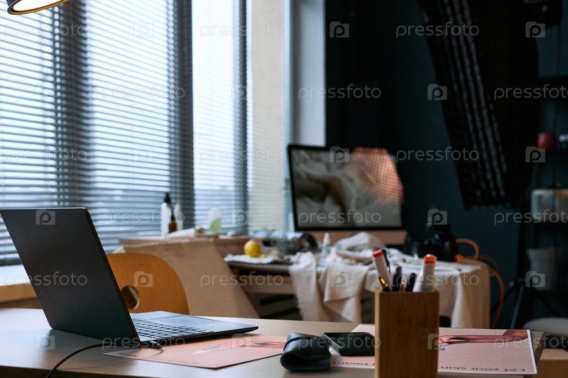 Современное рабочее пространство с ноутбуком и творческими инструментами в Sunlit Studio