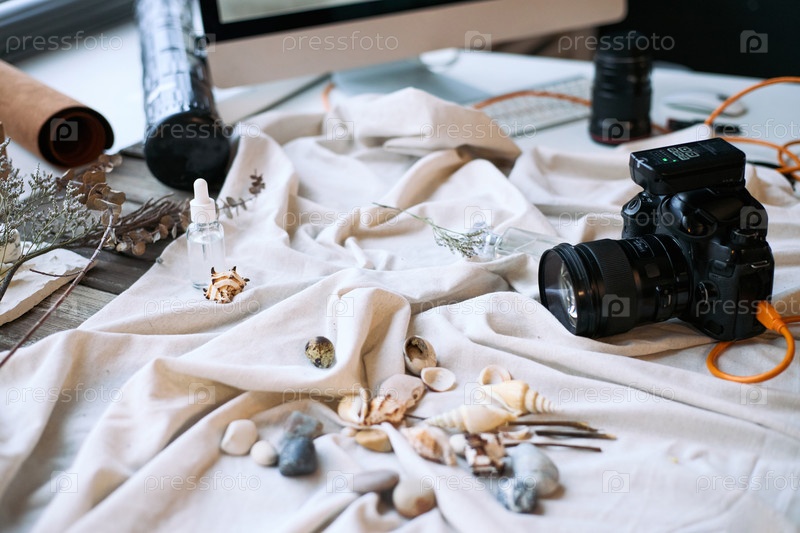 Камера и естественные объекты, расположенные на ткани для профессиональной съемки продукта