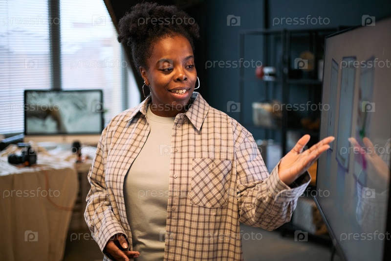 Молодая взрослая чернокожая женщина представляет цифровой контент на интерактивном экране