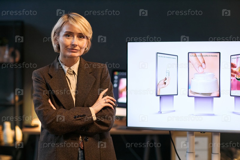 Портрет белой женщины среднего возраста, стоящей возле экрана цифровой презентации