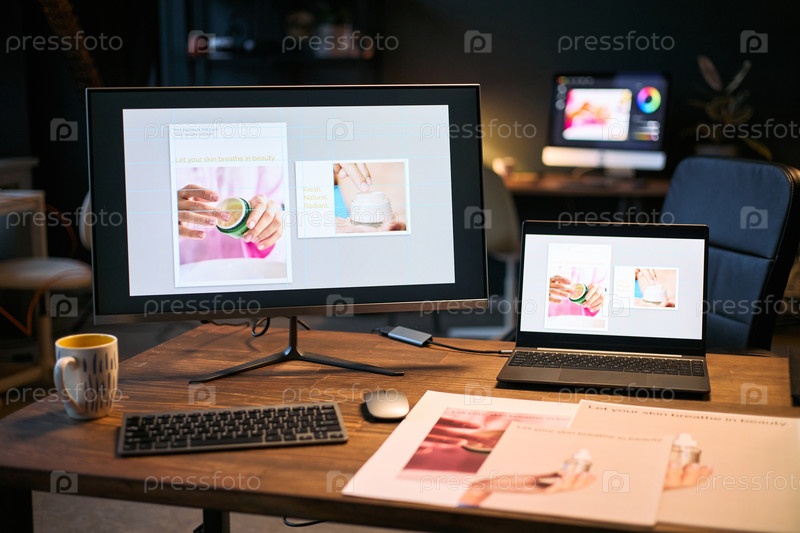 Рабочее место с компьютером и ноутбуком, отображающим современный дизайн продуктов по уходу за кожей