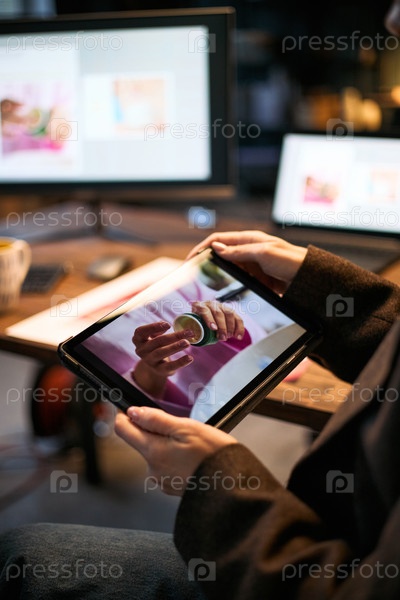 Кавказская женщина использует цифровой планшет для творческого проекта