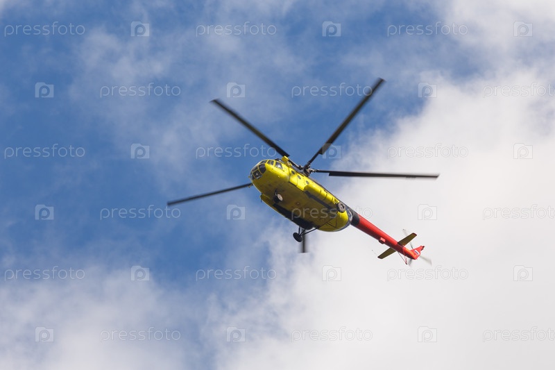Желто-оранжевый вертолет Ми-8 в полете на фоне голубого неба с облаками