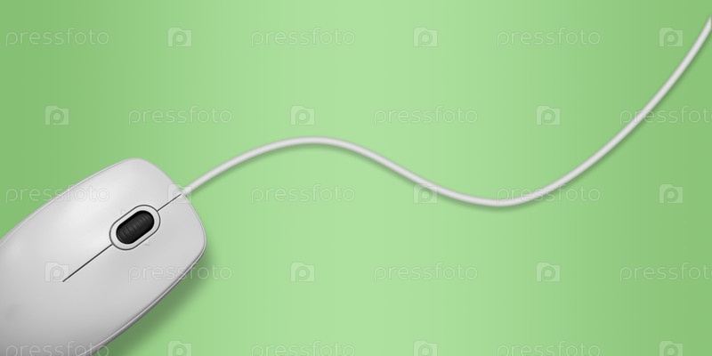 Светло-серая компьютерная мышь с проводом на зеленом фоне