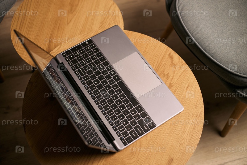 Современный ноутбук-компьютер, сидящий на деревянном столе во время онлайн урока обучения