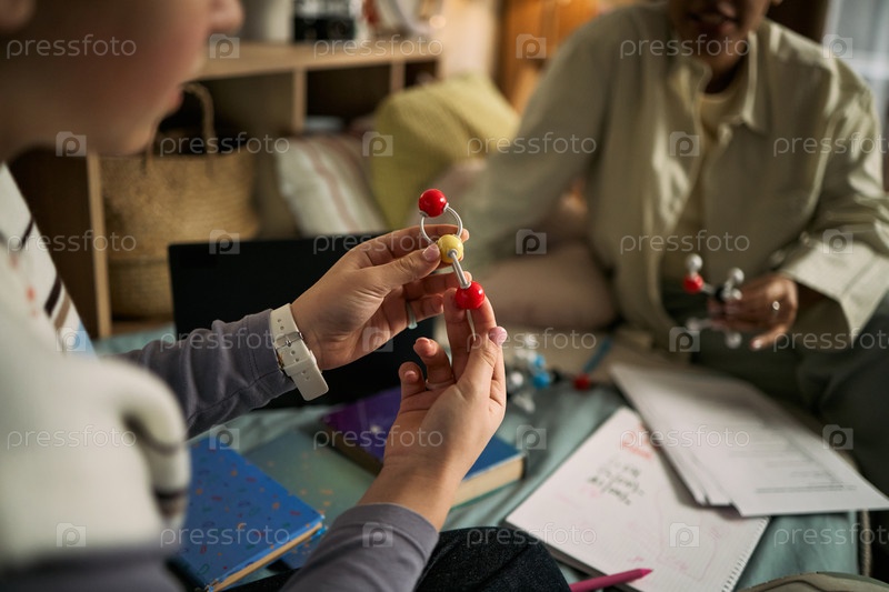 Девочка-подросток изучает химию с женским репетитором, используя набор молекулярных моделей