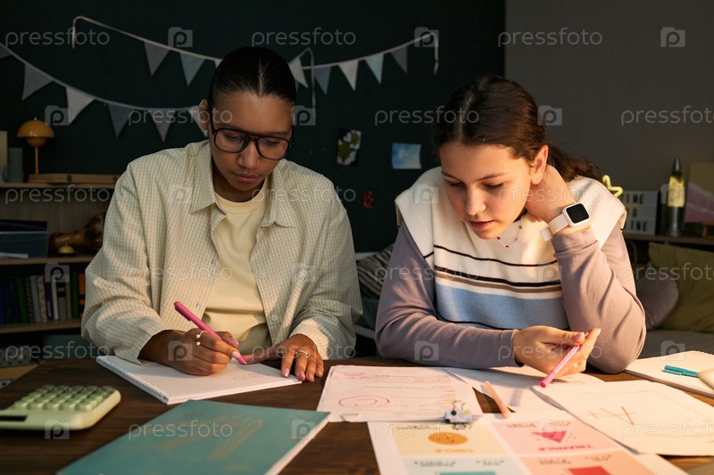 Подростки учатся вместе во время урока с репетитором в классной обстановке