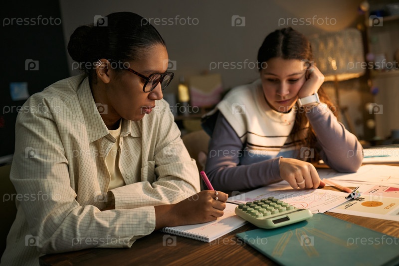 Молодая взрослая черная женщина обучает девочку-подростка во время урока