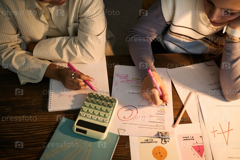 Девочки-подростки изучают математику вместе во время частного урока обучения