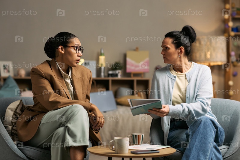 Молодая взрослая женщина обучает молодую взрослую черную женщину во время урока