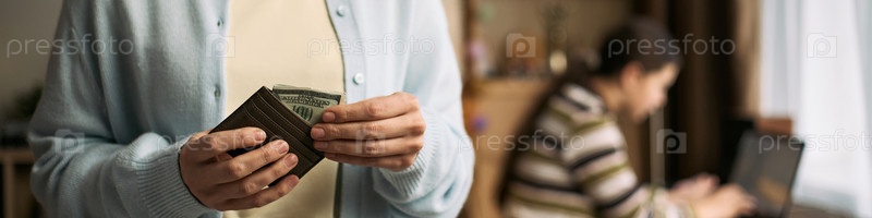 Женщина средних лет держит бумажник, в то время как подросток учится онлайн