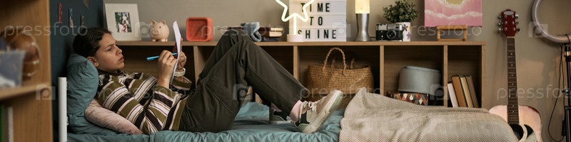 Подросток лежит на кровати, слушая онлайн-уроки с репетитором