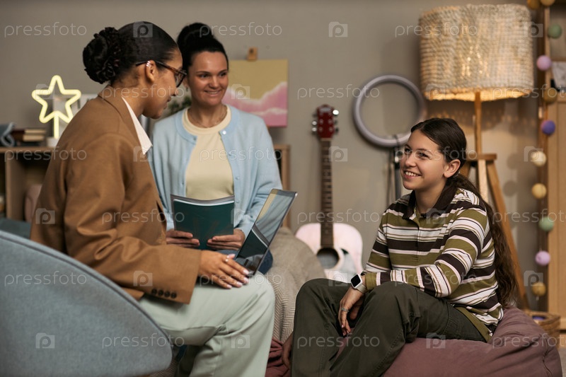 Подростковая девочка улыбается, получая урок от женского репетитора