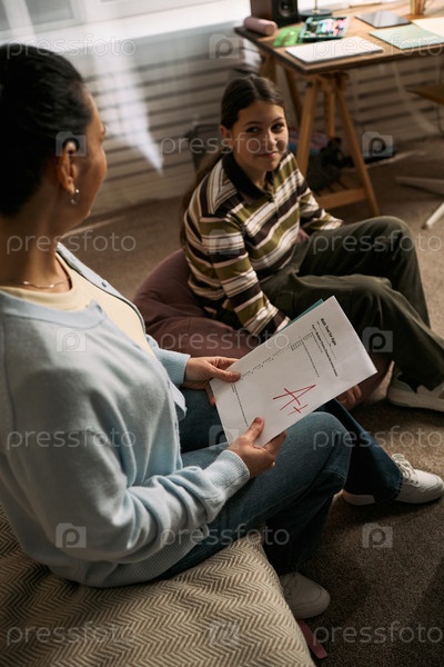 Репетитор показывает результаты тестов подростку во время урока