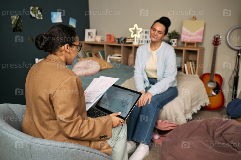 Молодая женщина обучает молодого взрослого чернокожего женщины с помощью ноутбука и бумаг