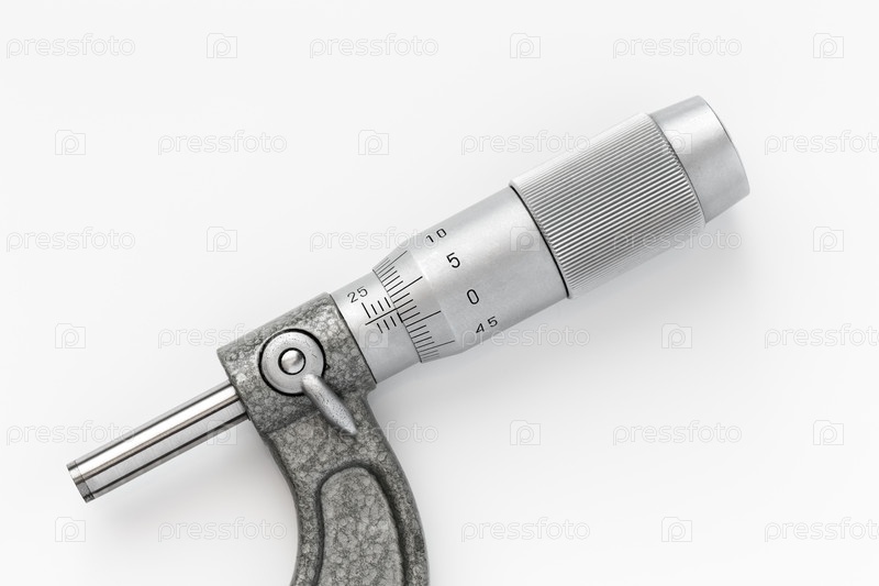 Фрагмент точного микрометра с шкалой Вернье на белом фоне