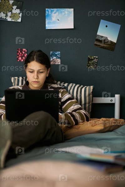 Девушка-подросток сосредотачивается на виртуальном обучении в спальне
