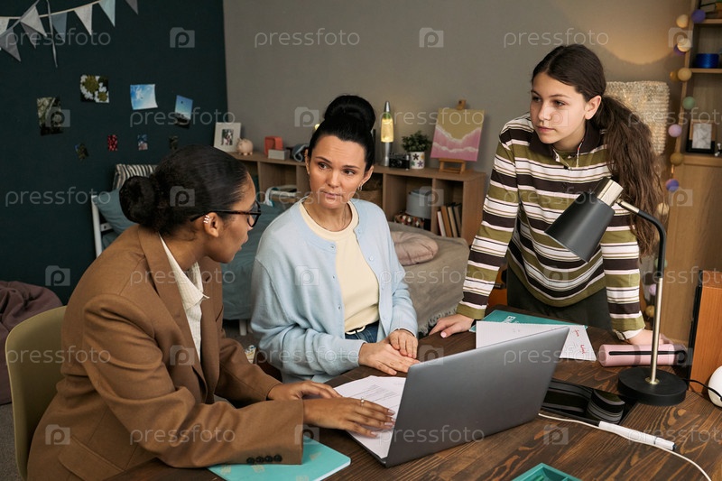 Мультиэтнические девочки-подростки, использующие ноутбук во время урока