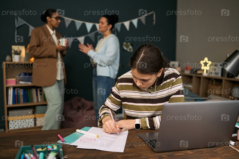 Подростковая девочка учится во время урока, в то время как женские репетиторы обсуждают