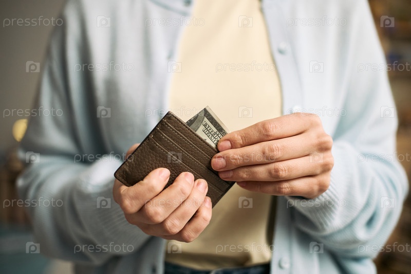 Молодая взрослая женщина держит кошелек и снимает наличные во время урока