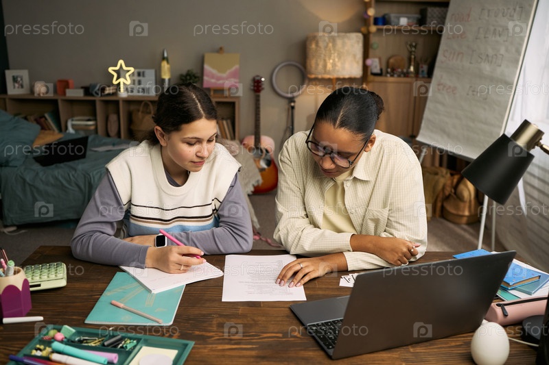 Подростковая девочка учится у женского репетитора во время частного урока
