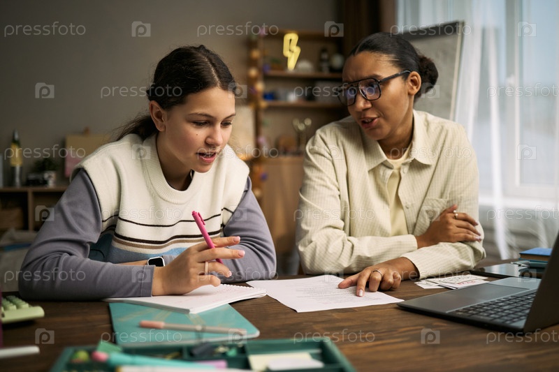 Девушка-подросток учится у репетитора среднего возраста во время урока