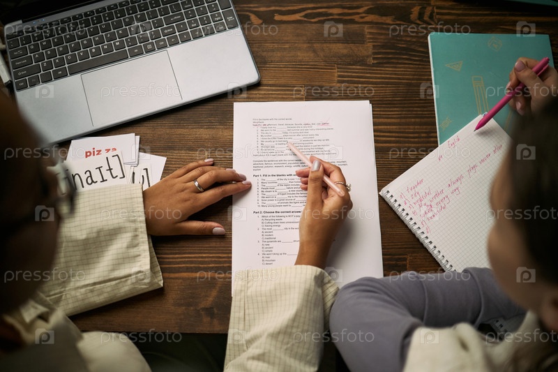 Молодой взрослый репетитор направляет девочку-подростка во время урока на рабочем столе