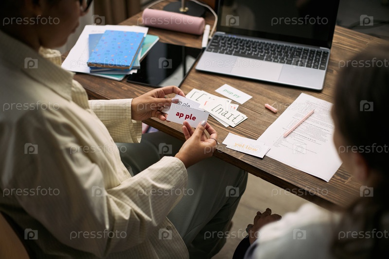 Молодой взрослый репетитор преподает ребенку навыки чтения во время урока