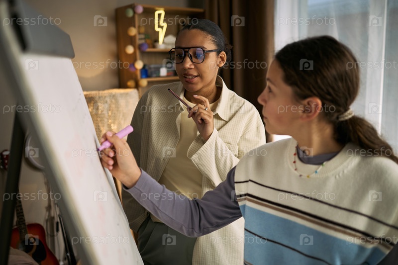 Молодая девушка учится у чернокожего репетитора во время частного урока