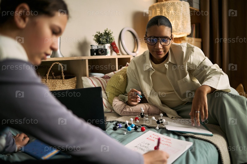 Молодой взрослый женский репетитор преподает девочку-подростка урок химии удаленно