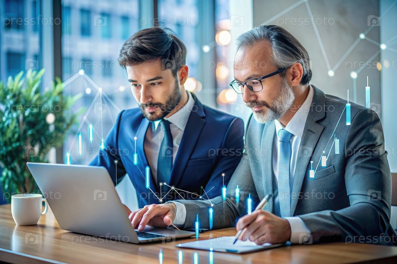 Два бизнесмена просматривают финансовые данные на ноутбуке и бумажных документах