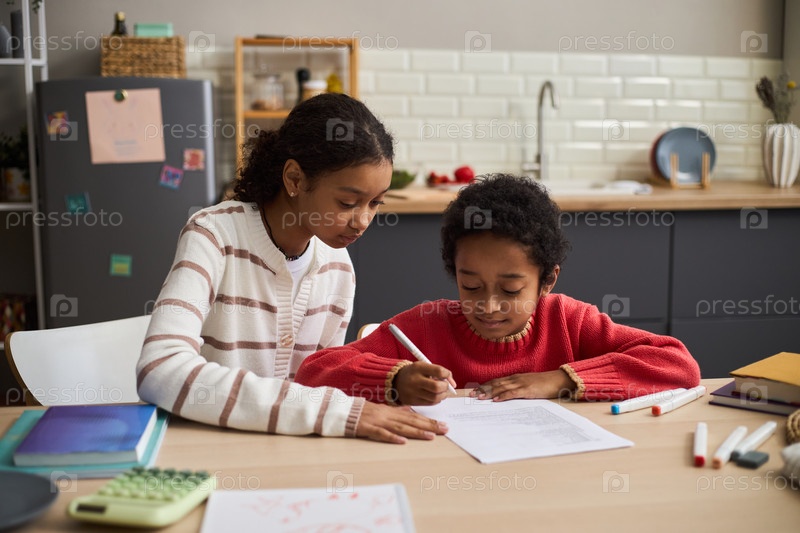 Черная девочка-подросток помогает молодому черному мальчику делать домашнее задание за столом