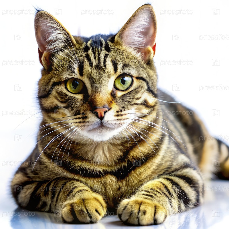 Близкий портрет кота Тэбби, отдыхающего на белой поверхности