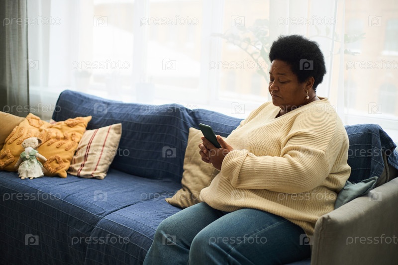Чернокожая женщина среднего возраста, сидящая на диване и использующая смартфон в помещении