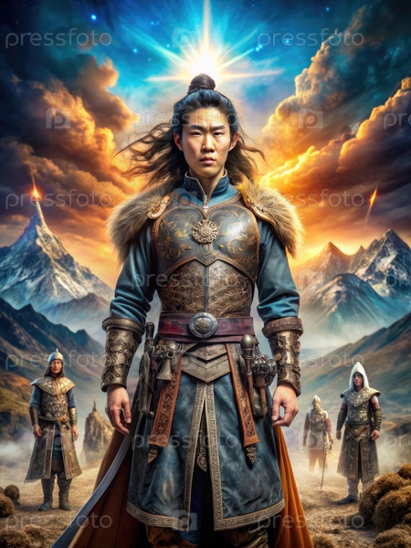 Киргизский воин, стоящий с гордостью против эпического горного пейзажа