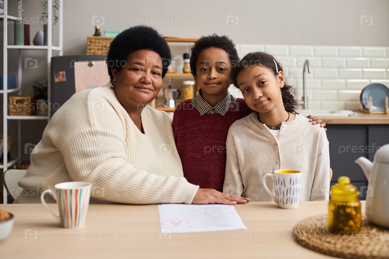 Портрет старшей чернокожей женщины, сидящей с двумя чёрными детьми в помещении