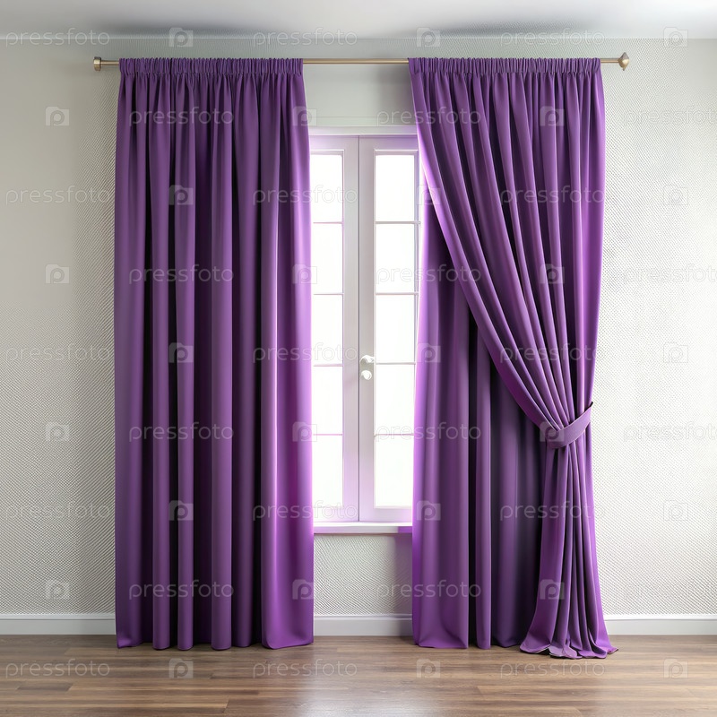 Пара фиолетовых штор висит в комнате с белой стеной