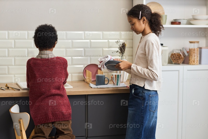 Черная девочка-подросток высушивает посуду рядом с черным ребенком и моет тарелки на кухне